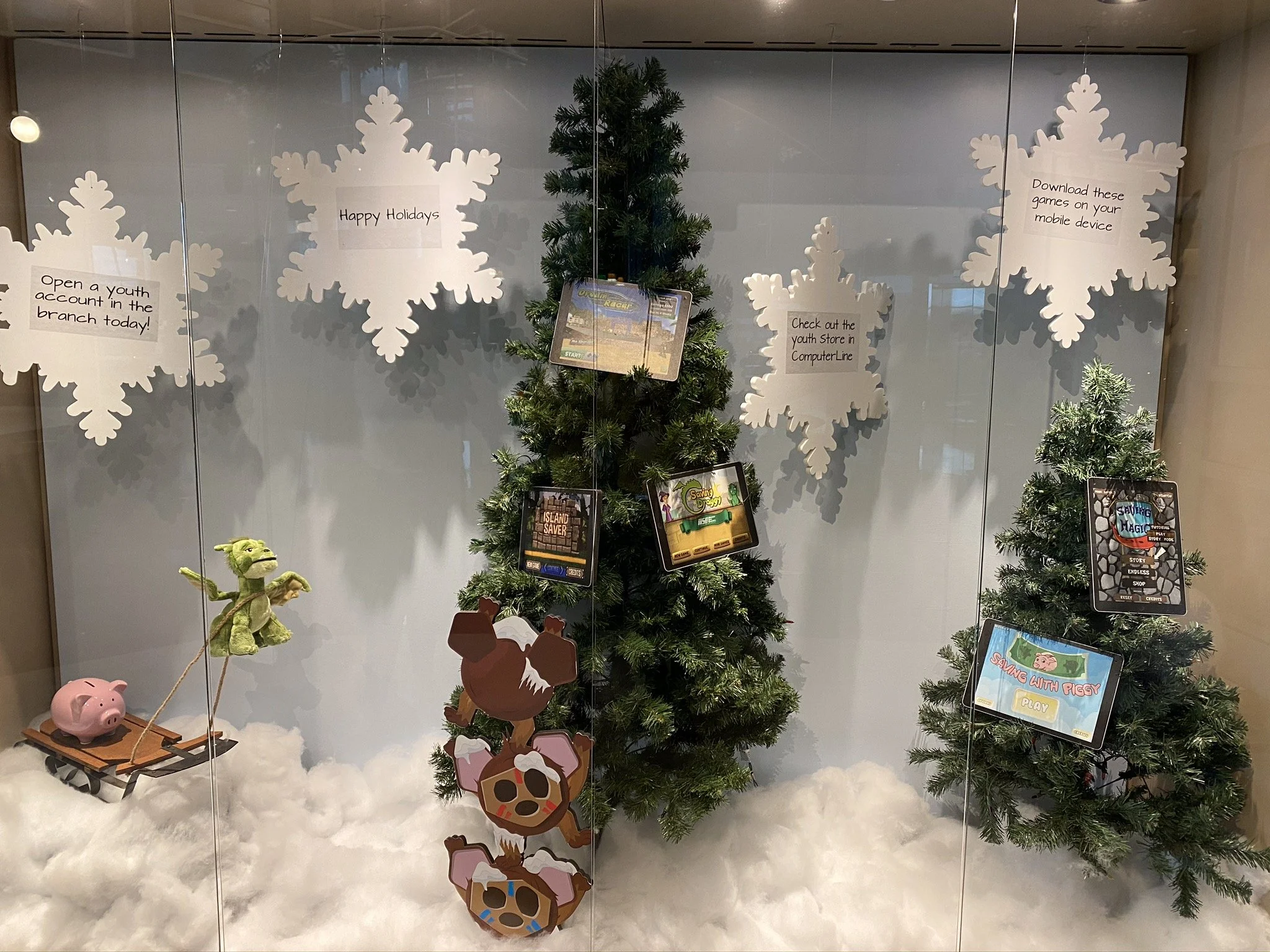 The second display was created around the holidays and aimed to educate families on the importance of kids' savings accounts. It also highlighted the fun, interactive financial education tools available at the credit union, including video games and engaging learning experiences. The design included: